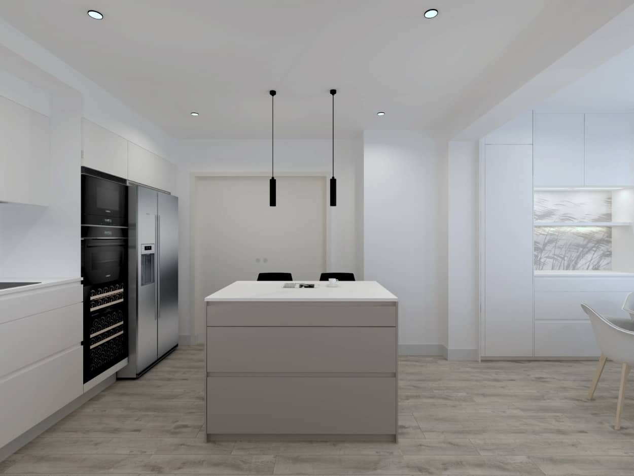 El mobiliario, de frentes lisos en acabado blanco mate y sin tiradores, crea un conjunto limpio y ordenado que potencia la sensación de homogeneidad. La encimera blanca, junto con el frente en el mismo tono, refuerza la luminosidad del espacio y aporta una estética uniforme. El pavimento de madera en tonos naturales añade calidez y contrasta suavemente con el blanco dominante, equilibrando el ambiente.