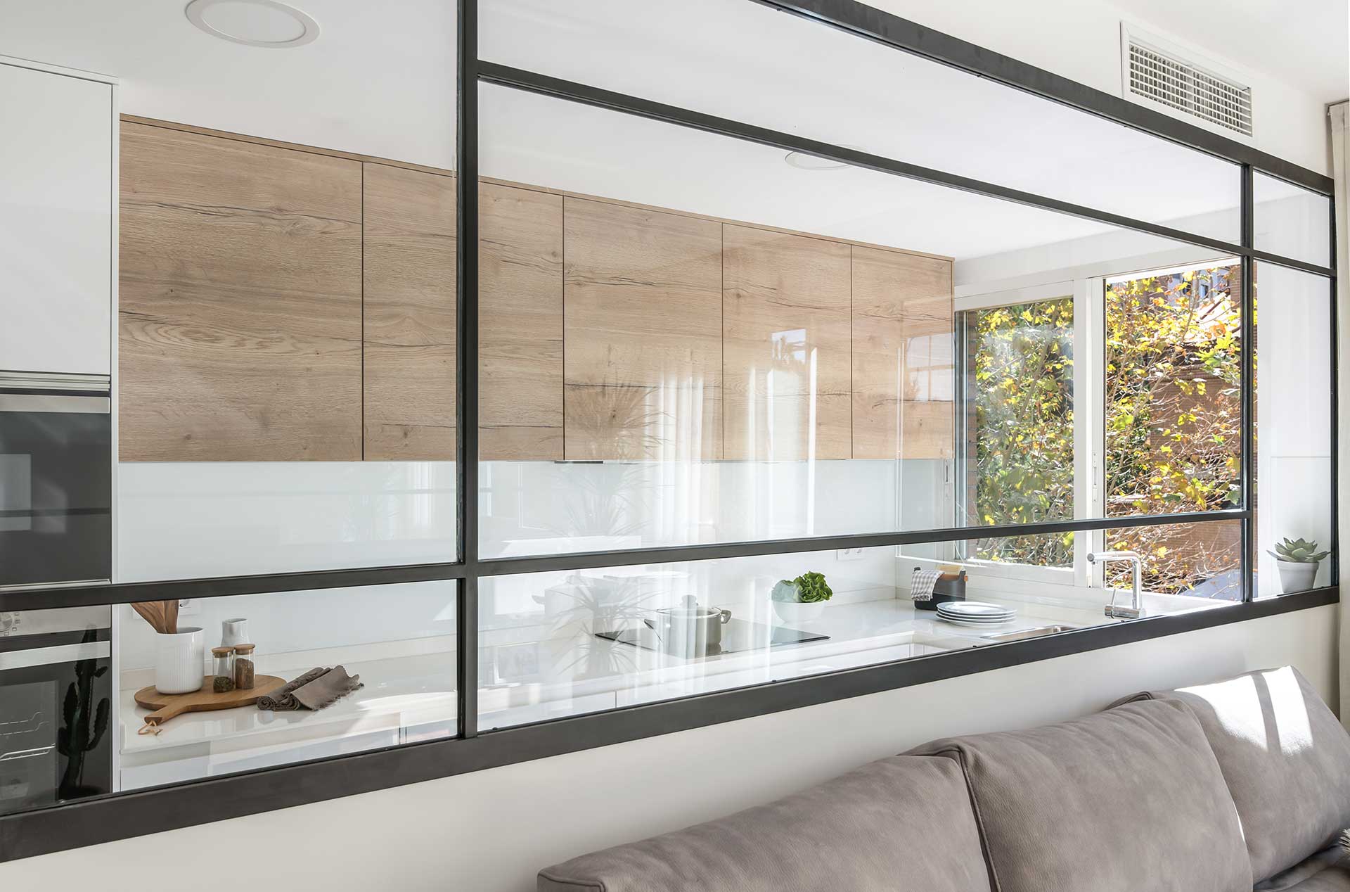 Cocina en color blanco y Roble de Santos con separación del salón mediante vidriera de cristal transparente.