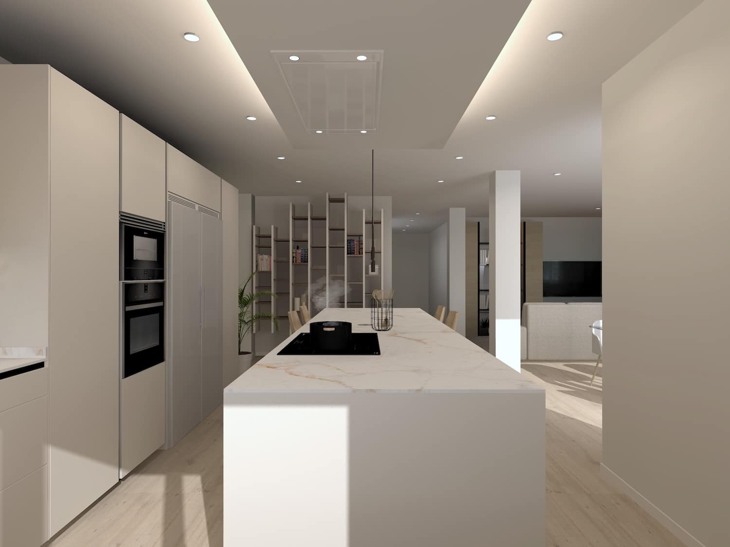 Justo encima de la isla, hemos puesto refuerzo de doble techo, tipo cubo invertido con retroiluminación para el uso de la campana de techo en blanco del modelo Compac Pure Line.