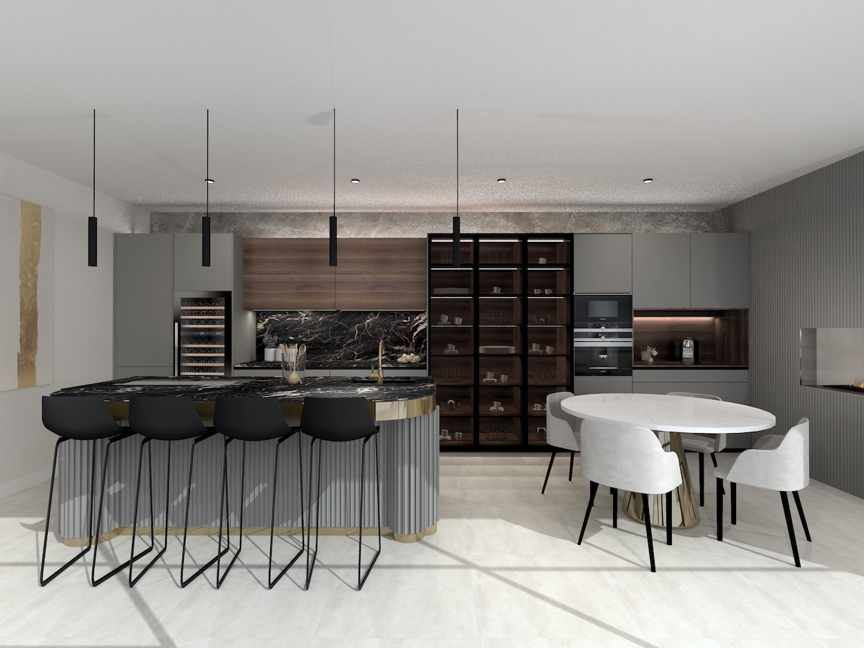 Cocina lujosa en color gris visón abierta al salón con isla en forrado contrachapado flexible y revestimiento perfil para el precioso borde en chapa de latón con detalles en satinado mate.