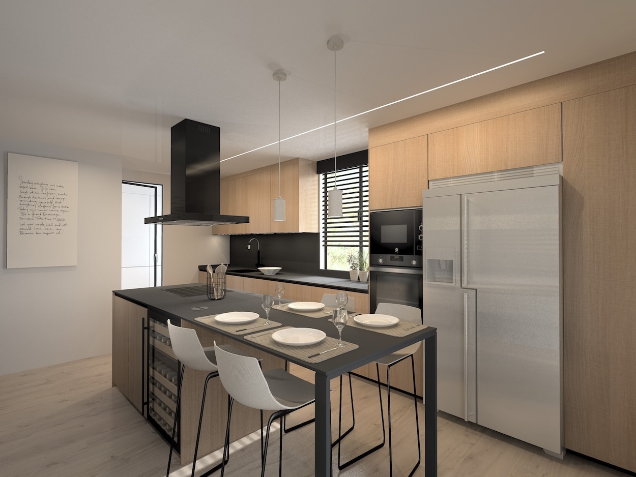 La isla central es el elemento principal de la cocina, con pata de acero en el mismo color negro de la encimera, con suficiente espacio para la preparación de alimentos, y donde hemos dispuesto la zona de fuego; hemos incorporado una vinoteca, permitiendo a los amantes del vino tener sus mejores botellas siempre a mano y a la temperatura adecuada.