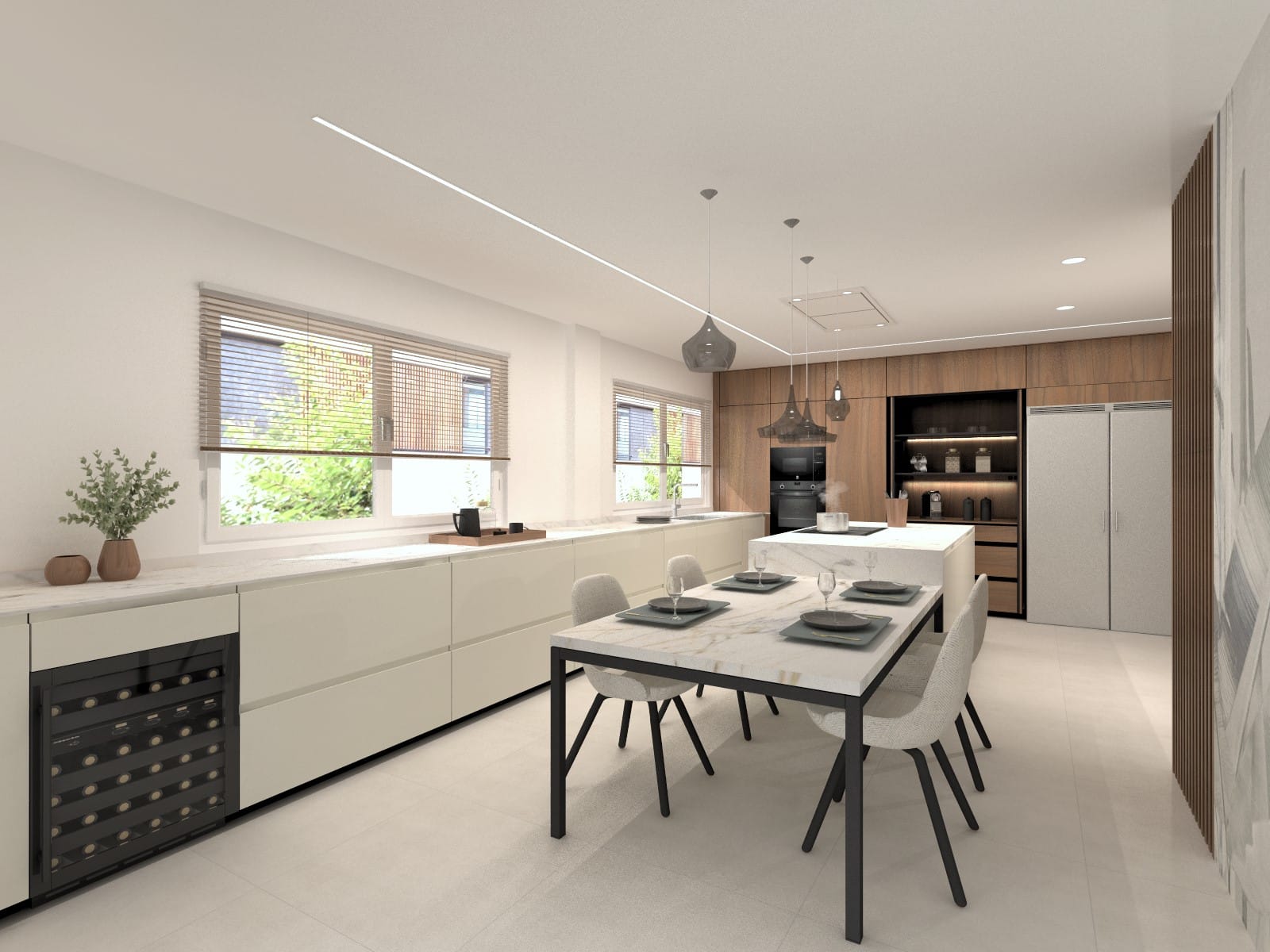 Proyecto de Cocina Santos, muy espaciosa, diseñada con funcionalidad y con una distribución cuadrada y amplia, que ofrece un ambiente abierto y cómodo para disfrutar de todo el espacio. Los muebles bajos proporcionan un amplio espacio de almacenamiento, mientras que la isla central se convierte en el corazón de la cocina, ofreciendo tanto espacio de trabajo como una zona de desayuno integrada.