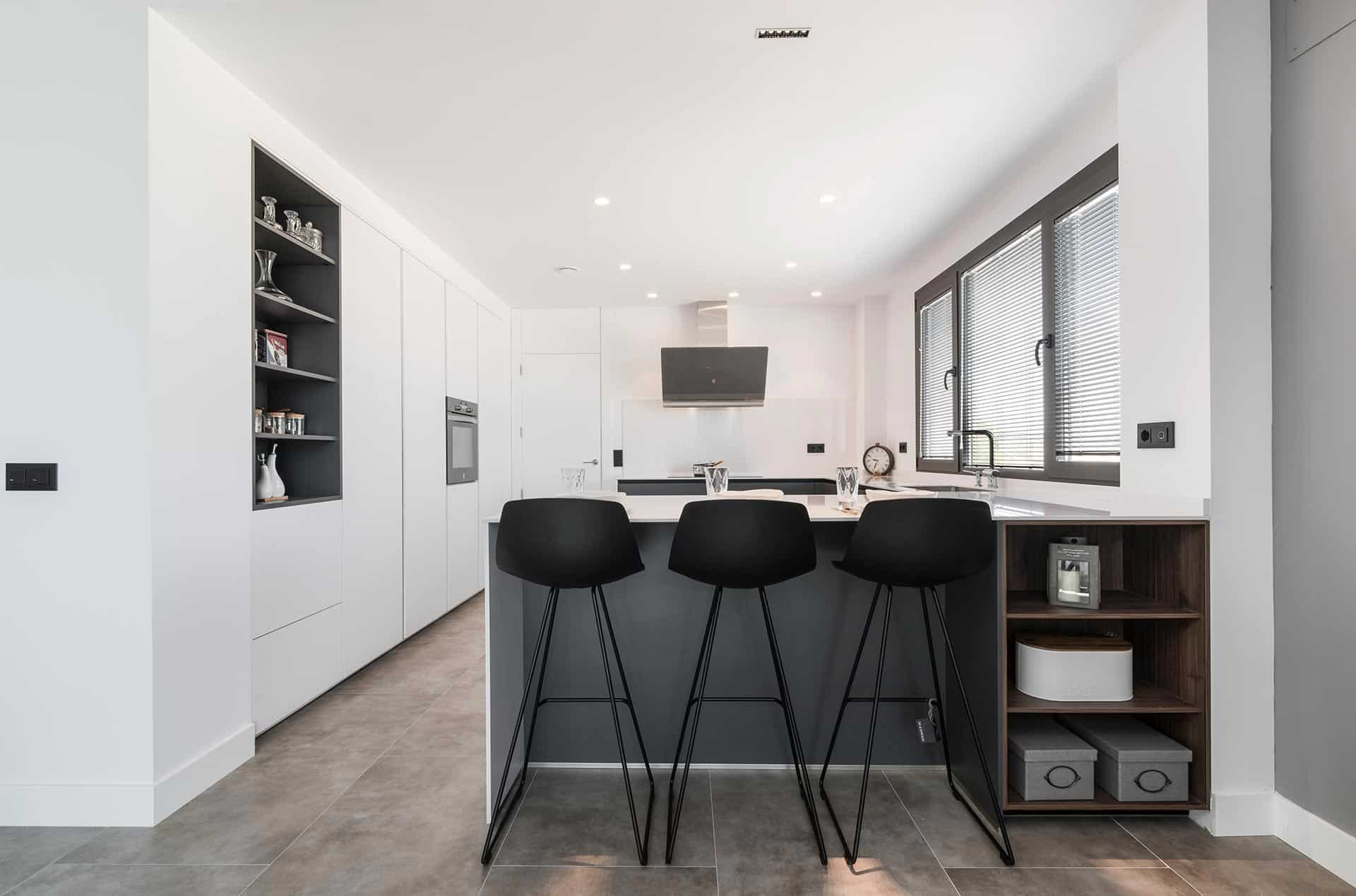 La distribución de la cocina en U permite la comunicación con el salón mediante una península que además tiene la utilidad de barra de cocina. Para aportar un toque extra de diseño, se han dispuesto taburetes negros de diseño de la firma «La Palma».