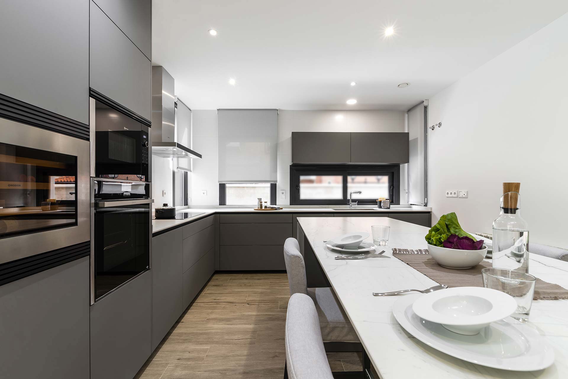 Todo el espacio, diseñado en tono gris visón seda y encimera en blanco Montblanc de Neolith, combinado con una pared también en color blanco y un suelo cerámico con acabado de madera de roble, hacen de esta cocina un lugar sofisticado, sencillo y multifuncional, perfecto para cualquier hogar.