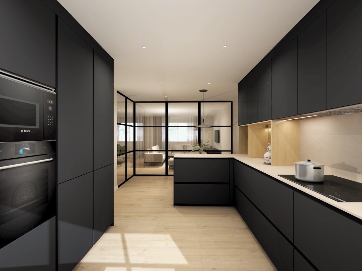 Esta cocina en forma de U destaca por su impactante diseño contemporáneo, donde la elegancia del negro mate se combina con detalles en madera clara y superficies neutras para crear un espacio sofisticado, cálido y altamente funcional. La distribución perimetral maximiza la superficie útil y permite una circulación fluida, generando tres frentes de trabajo que facilitan la organización y la eficiencia diaria.