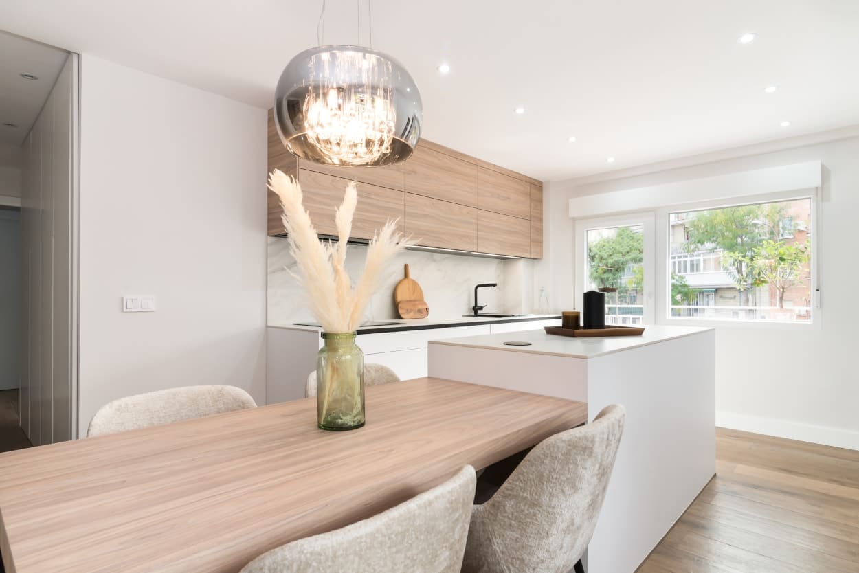 Este proyecto de cocina, tiene un diseño moderno y atemporal, el cual se integra a la perfección con la decoración y estilo del resto de la vivienda, creando un espacio abierto, amplio y luminoso.