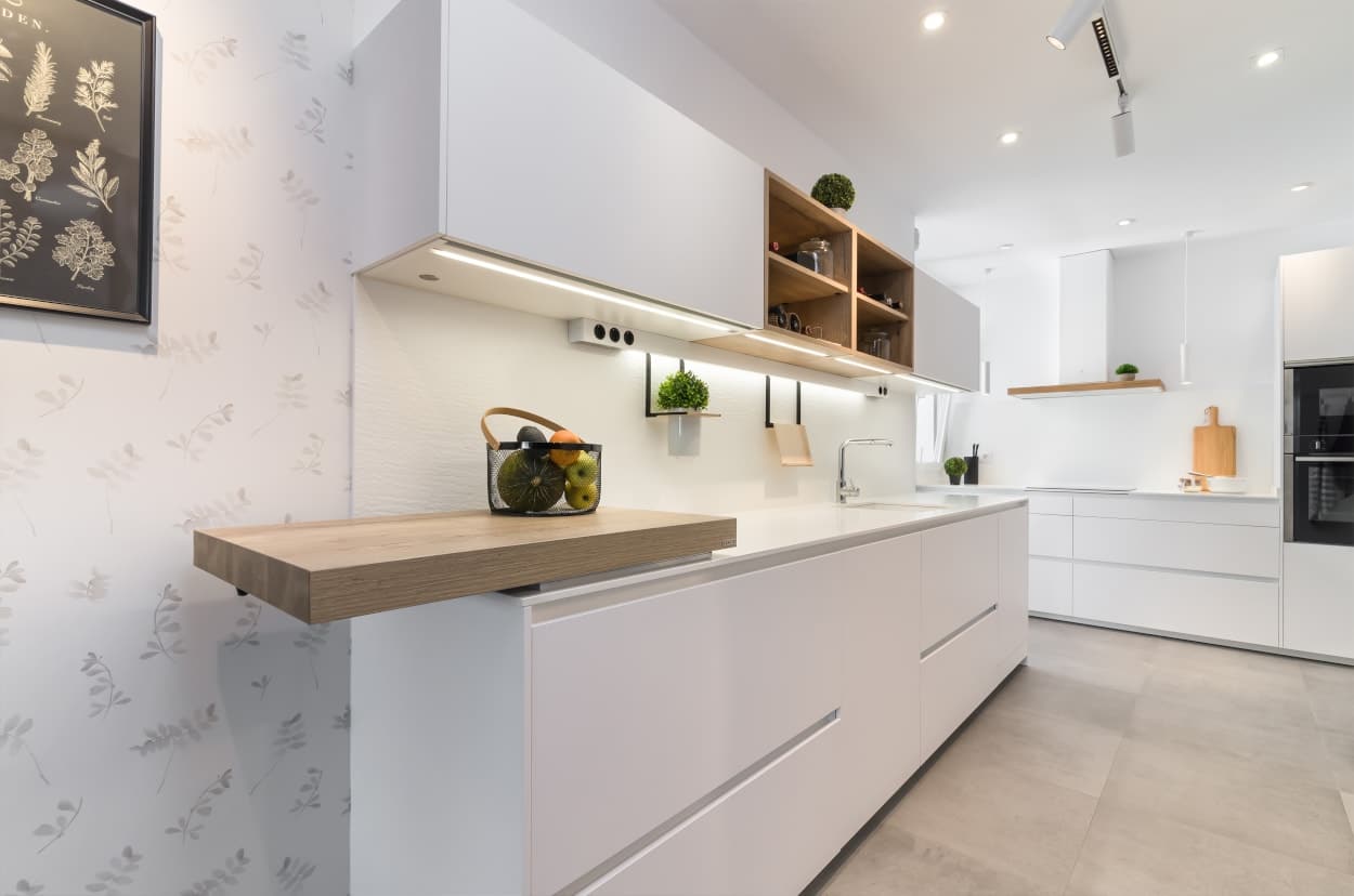 Diseño de cocina Santos en Blanco innsbruck y roble rústico con material estratificado y laminado.