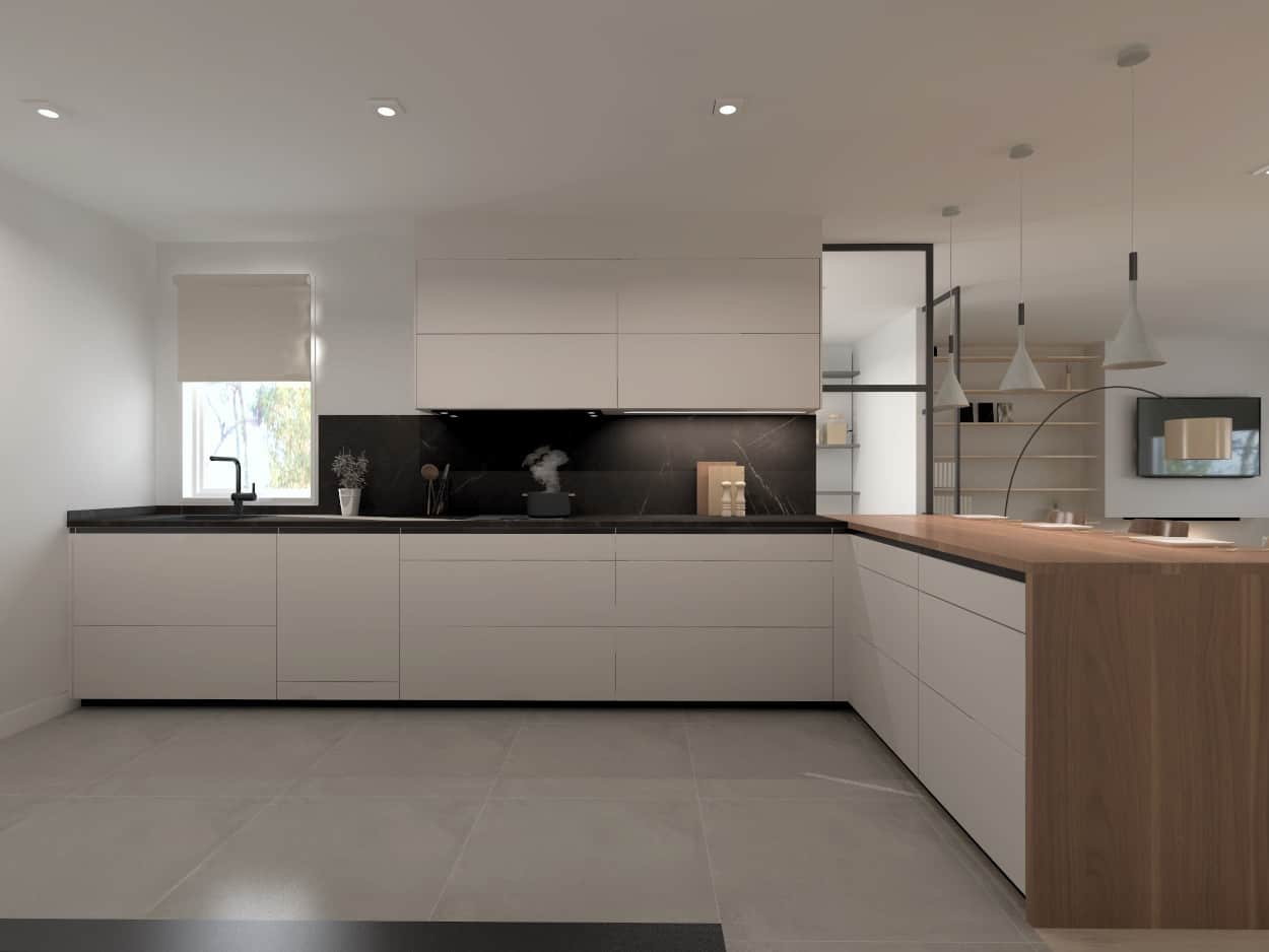 Su distribución se compone por un frente en forma de L con una barra y un mueble desayunador con columnas para los grandes electrodomésticos.