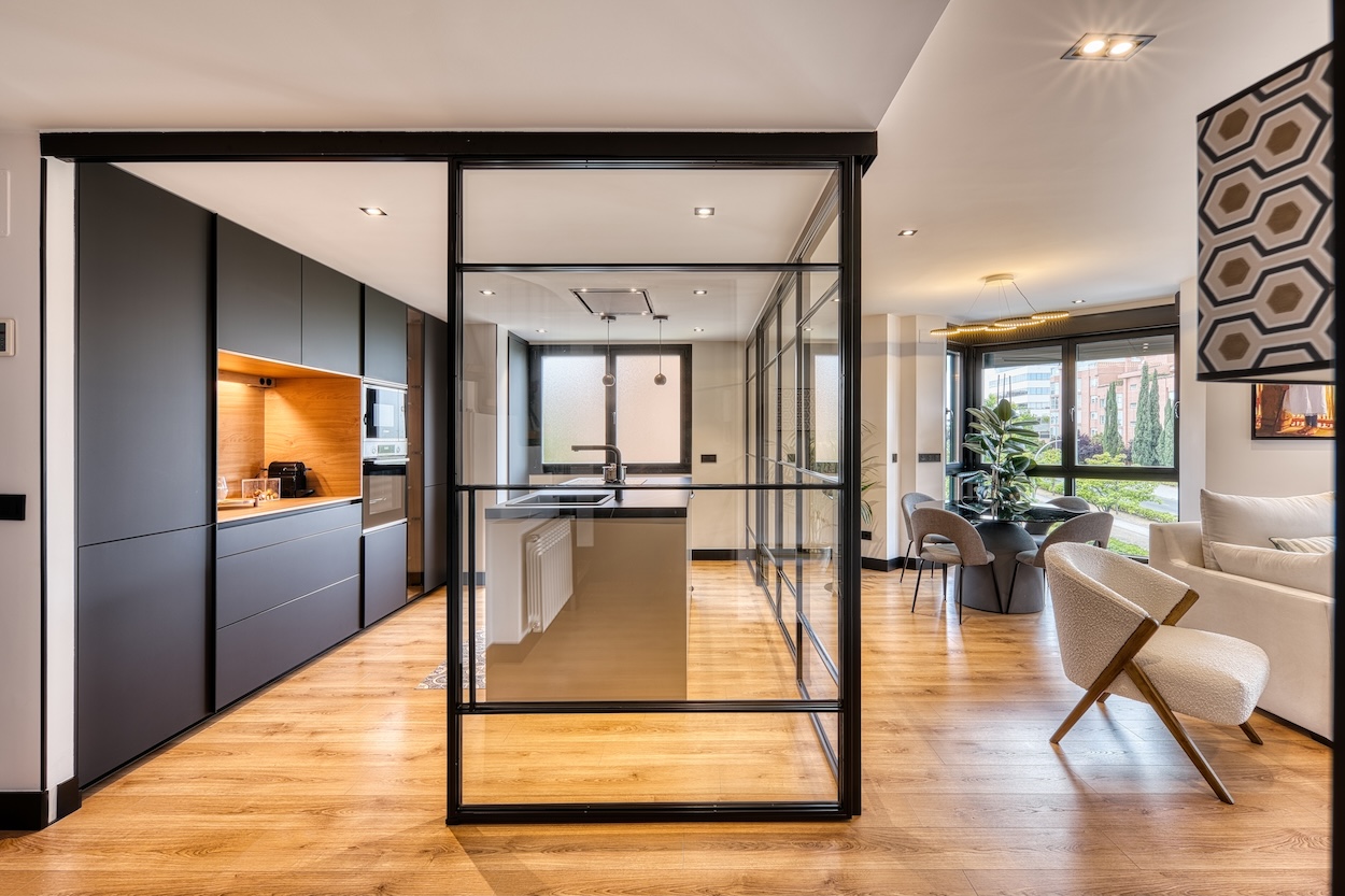 Para completar el diseño, la cocina está cerrada alrededor por puertas correderas en aluminio negro con cristal, que no solo proporcionan un elemento de privacidad cuando es necesario, sino que también permiten que la luz natural fluya a través del espacio, manteniendo una sensación de luminosidad y apertura.
