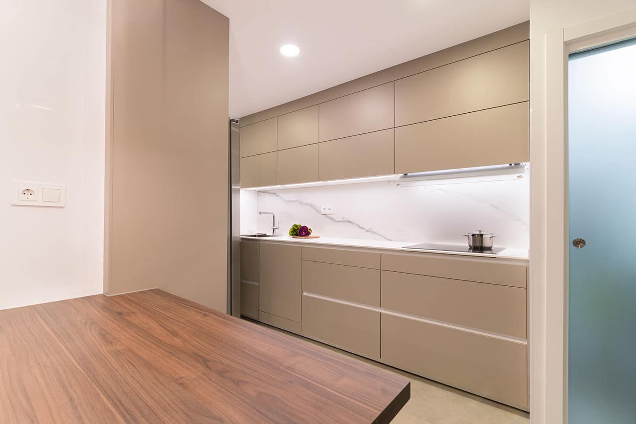 El cliente ha optado por una encimera porcelánica en un tono claro con betas sutiles de la marca Inalco (modelo Larsen blanco-gris) que añade profundidad visual y textura al espacio. El contraste entre el gris arena de los muebles y la claridad de la encimera con la trasera del mismo modelo y color crea un equilibrio armonioso que refleja una estética contemporánea.