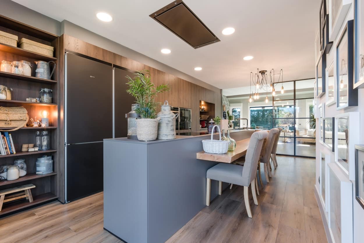 Además, de esta isla, se prolonga una gran barra en madera para siete comensales.
