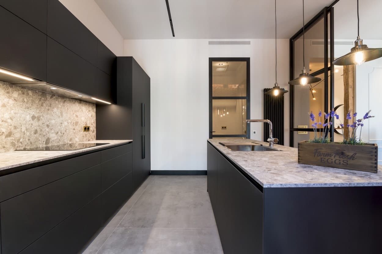 Diseño de cocina Santos en color negro seda con material estratificado.