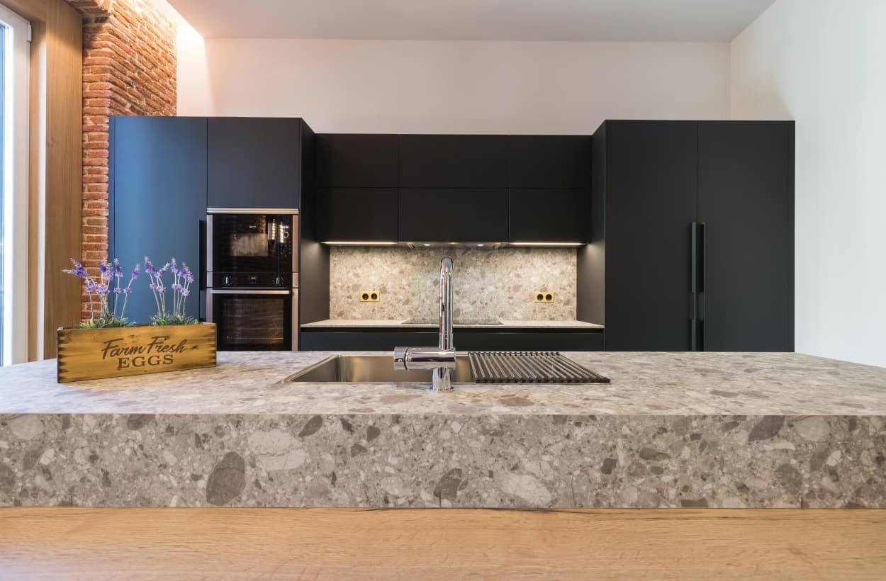Diseño de cocina Santos en color negro seda con material estratificado.