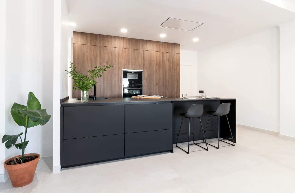 El diseño de esta cocina moderna es en color negro seda combinado con columnas en color nogal tierra, ambos colores, se fusiona en el espacio, creando un ambiente muy elegante sofisticado y con carácter.