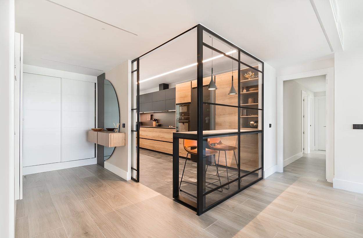 La cocina se limita por unas puertas correderas de cristal y aluminio negro, permitiendo el paso de la luz y manteniendo siempre el contacto visual entre las estancias.