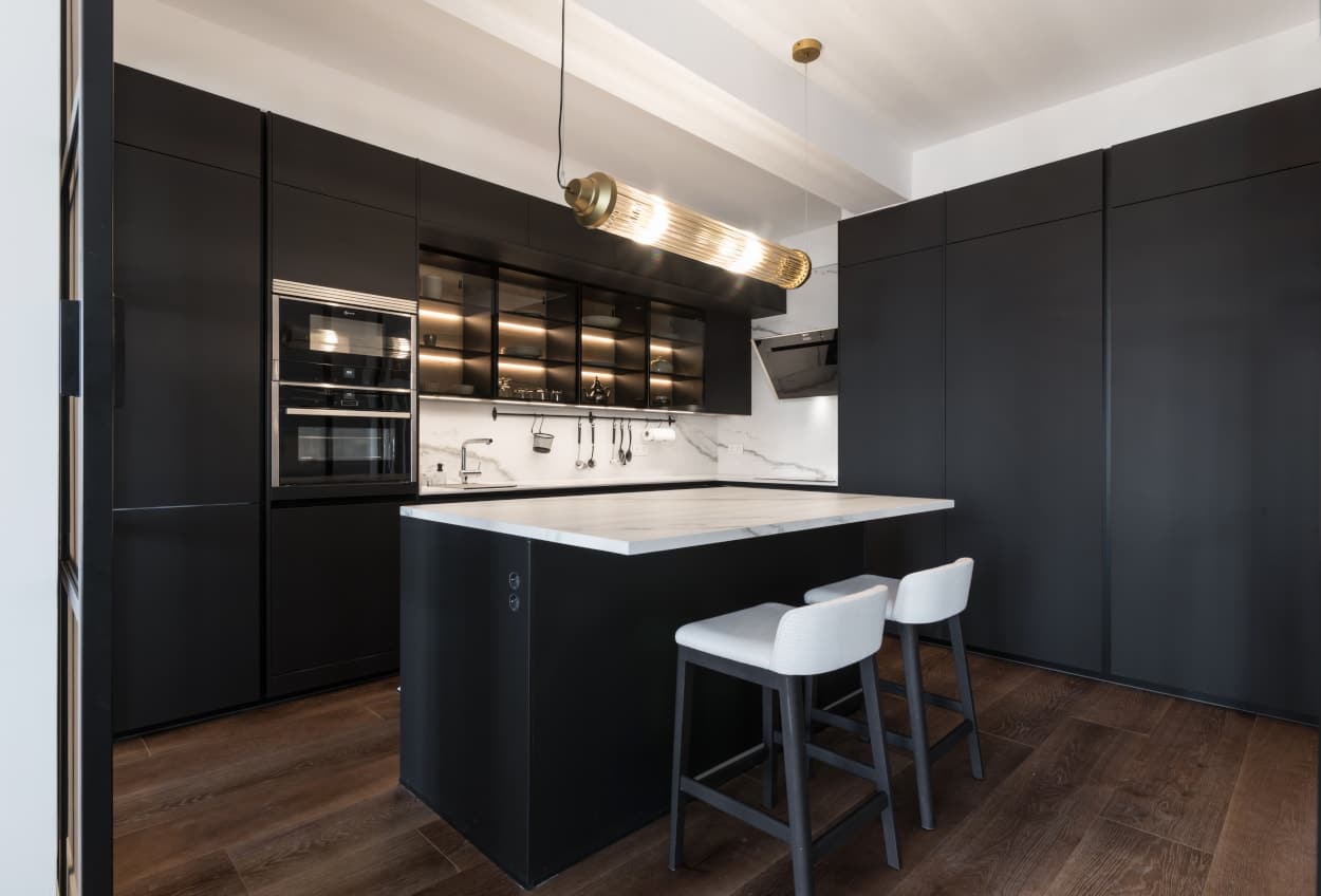 La cocina cuenta con dos puertas correderas de cristal y aluminio negro, permitiendo que la cocina permanezca abierta o cerrada al salón, según las necesidades de los usuarios.