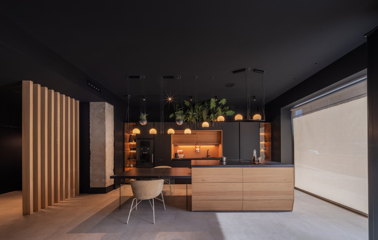 Esta cocina situada en nuestro showroom de Conde Orgaz deja sin palabras, el color negro seda combinado con el roble rústico, las vitrinas iluminadas y su enorme isla en cascada hacia la mesa de comedor crean la cocina perfecta, imponente y lujosa.