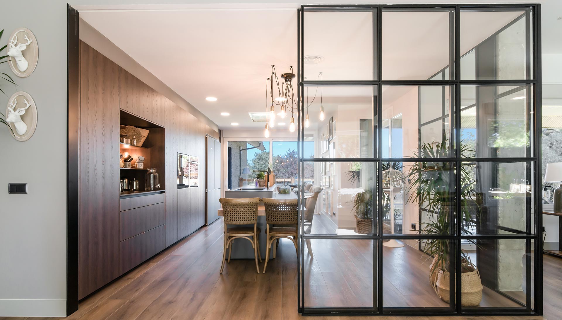 Cuenta con un cerramiento de cristal con el que se consigue integrar la cocina en el salón con una puerta deslizante que permite independizar la cocina o abrirla al salón.