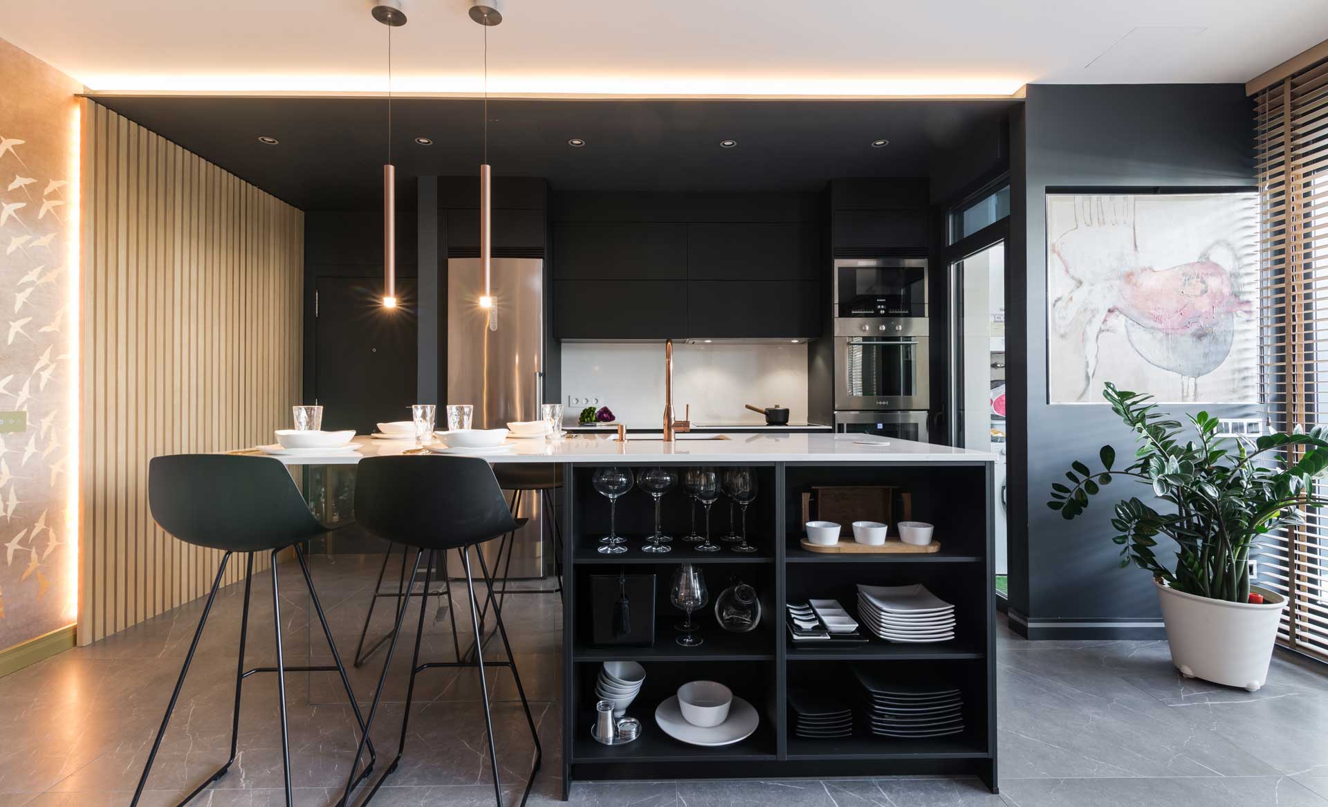 En las siguientes fotografías podrás disfrutar de algunas instalaciones de cocina de lujo con isla desarrolladas por nuestro estudio que te aportarán ideas para empezar a conformar tu próxima cocina. En el diseño de cocinas modernas con isla se pueden realizar todo tipo de soluciones en función del espacio con el que se cuente, cocinas abiertas al salón (cocinas americanas) con la isla ejerciendo como elemento separador, cocina con office integrado en la isla, entre otras muchas posibilidades.