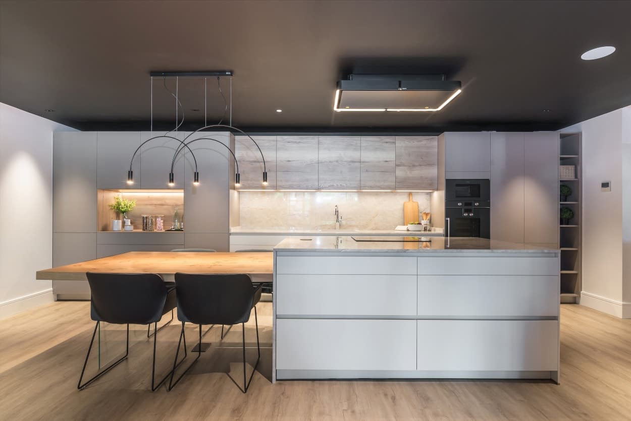 La combinación de los tres colores del mobiliario, la encimera y el mesado en roble, crean una combinación perfecta, haciendo de este espacio, un lugar único, con mucha personalidad y atemporal, perfecto para convertirse en el centro de la vivienda.