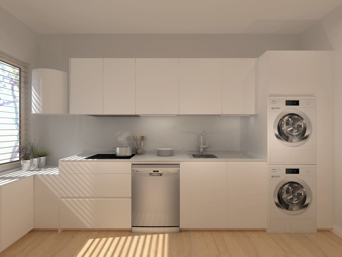 La inclusión de electrodomésticos de libre instalación, como el frigorífico, la lavadora, la secadora y el lavavajillas, permite una mayor versatilidad en el diseño de la cocina.