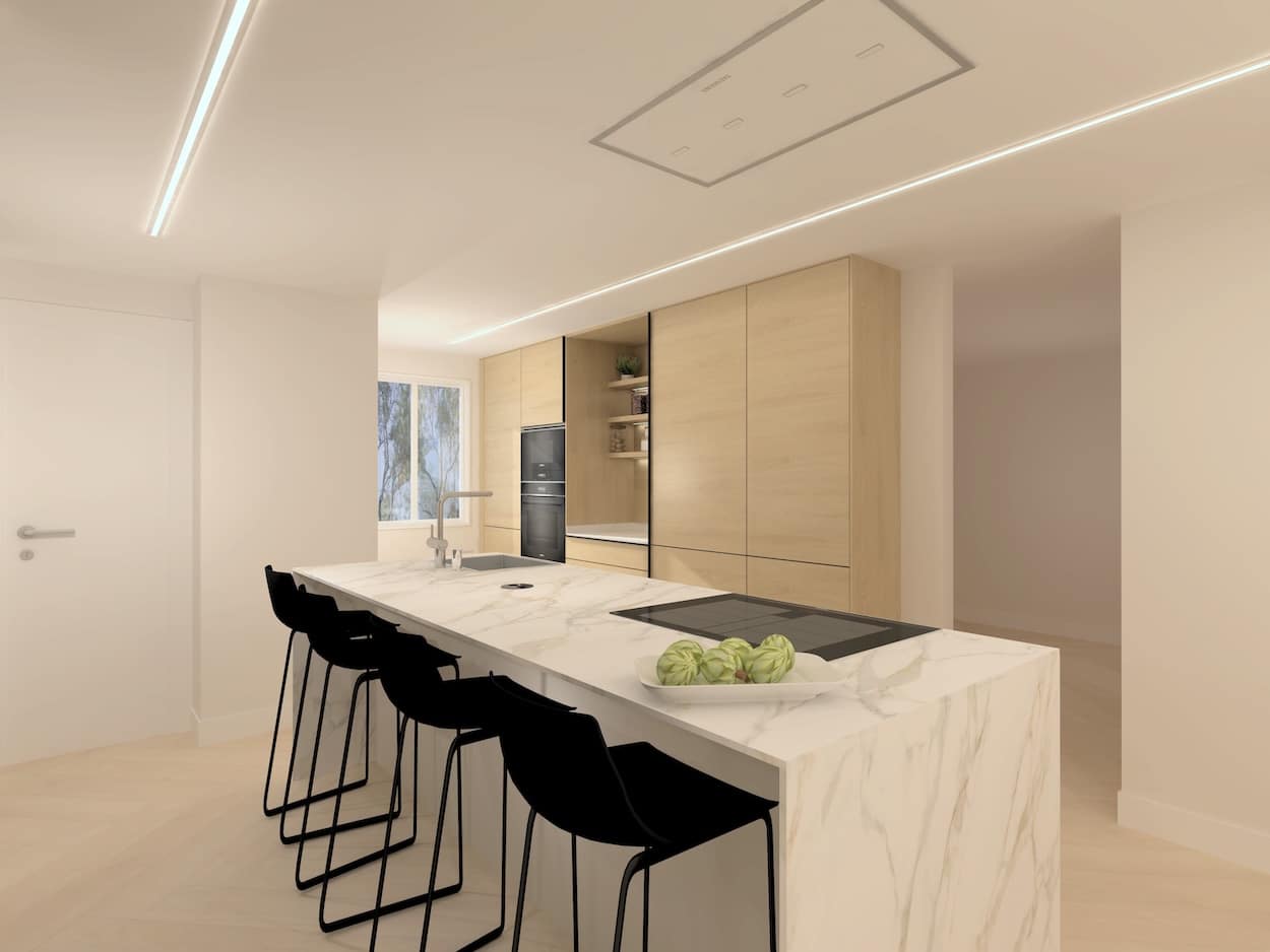 La isla, revestida en una imponente encimera de efecto mármol con vetas suaves, actúa como pieza protagonista. Integra zona de cocción, fregadero y espacio de preparación en una única superficie continua, acompañada de una barra con taburetes negros de diseño que invitan a compartir momentos en buena compañía. Su presencia aporta carácter y sofisticación, al tiempo que delimita visualmente las funciones del espacio.